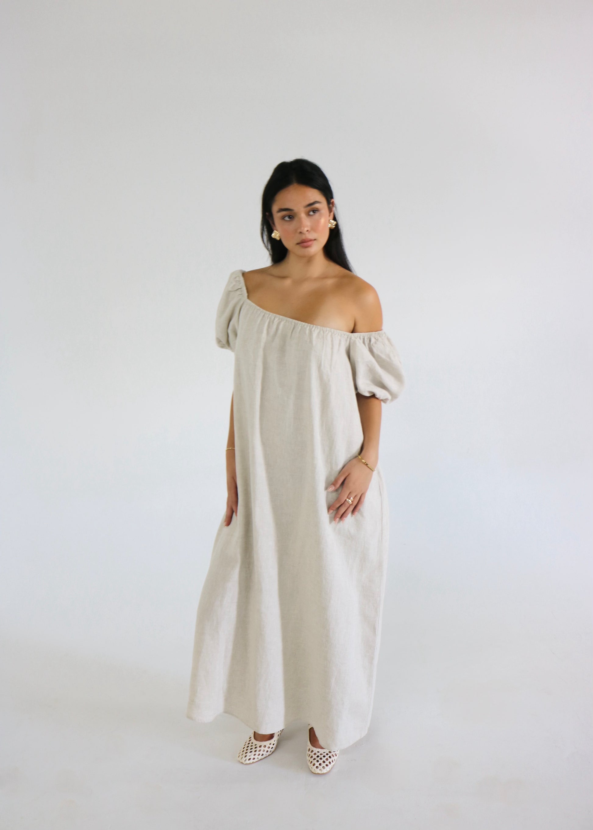 The Anela Dress is a timeless staple, effortlessly blending comfort with elegance. Made from soft, woven 100% linen, this maxi silhouette features romantic puff sleeves with gentle elastic at the shoulders and cuffs. The heather oatmeal color and flowy shape make it the perfect neutral base for any look.